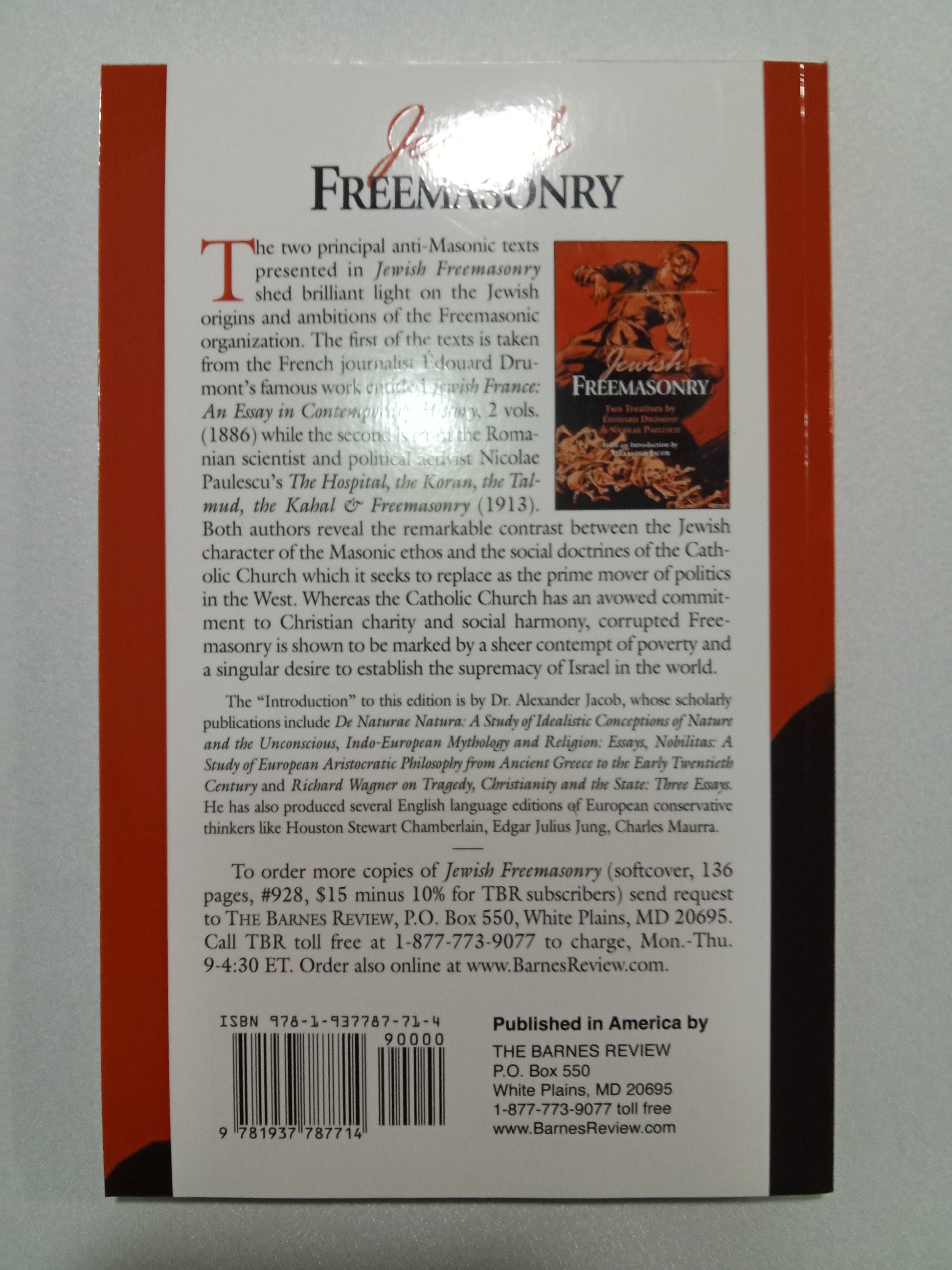 Jewish Freemasonry: Two Treatises by Édouard Drumont and Nicolae Paulescu. Edited by Dr. Alexander Jacob. The two anti-Masonic texts presented in this edition shed some light on the Jewish origins, structure, ancient lore, symbolism, beliefs, rituals and ambitions of the Free masonic organization at the end of the 19th and early 20th centuries.